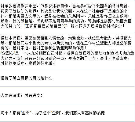 開堂的第一節(jié)課,他以《打開企圖心》為主題,以提問為主的方式,激發(fā)線上線下的學(xué)員深入思考:我們?yōu)楹味鴬^斗?我們因何而得到?既不是秀才(編者注:此語境下的含義為生活優(yōu)渥者)也不是落榜者(編者注:此語境下的含義為因失敗而發(fā)憤圖強(qiáng)者)的我們又當(dāng)以什么作為自身前進(jìn)的動力?……