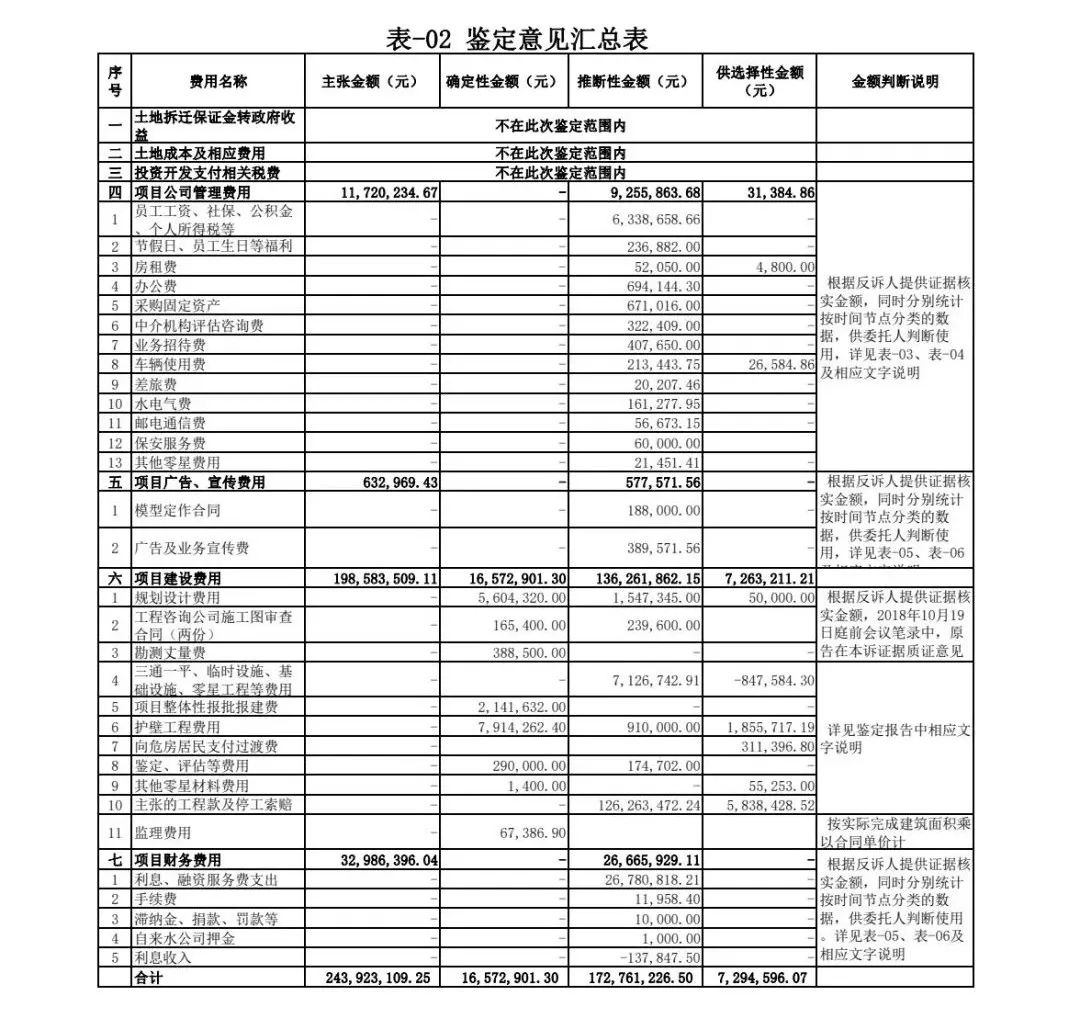 由于本項(xiàng)目涉及費(fèi)用項(xiàng)目、金額均較大,《鑒定意見書》中分別根據(jù)證據(jù)情況、國(guó)家文件規(guī)定、解除合同時(shí)間等分類方式,逐項(xiàng)對(duì)金額進(jìn)行了分類,并附加相關(guān)說明,為法庭判決提供了數(shù)據(jù)支撐。最終鑒定確定性金額16,572,901.30元,推斷性金額172,761,226.50 元,供選擇性金額7,294,596.07 元,具體詳表-02