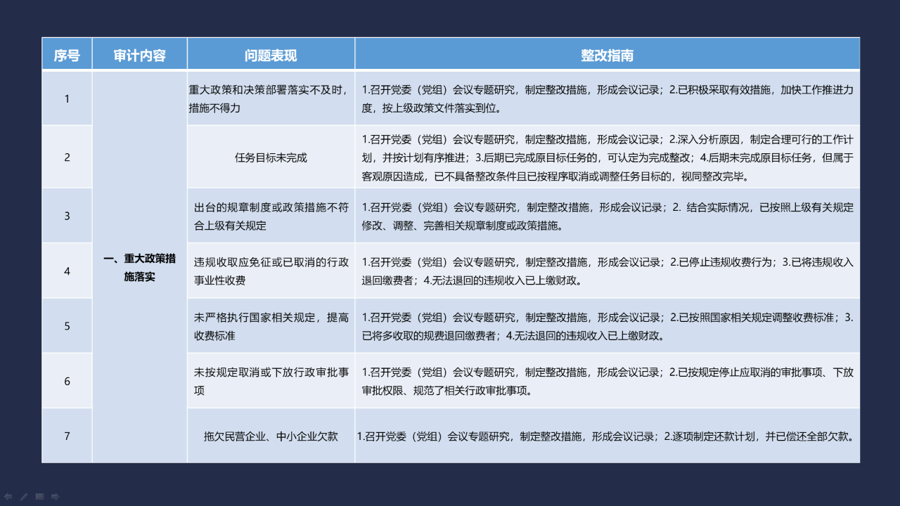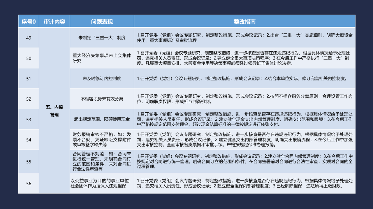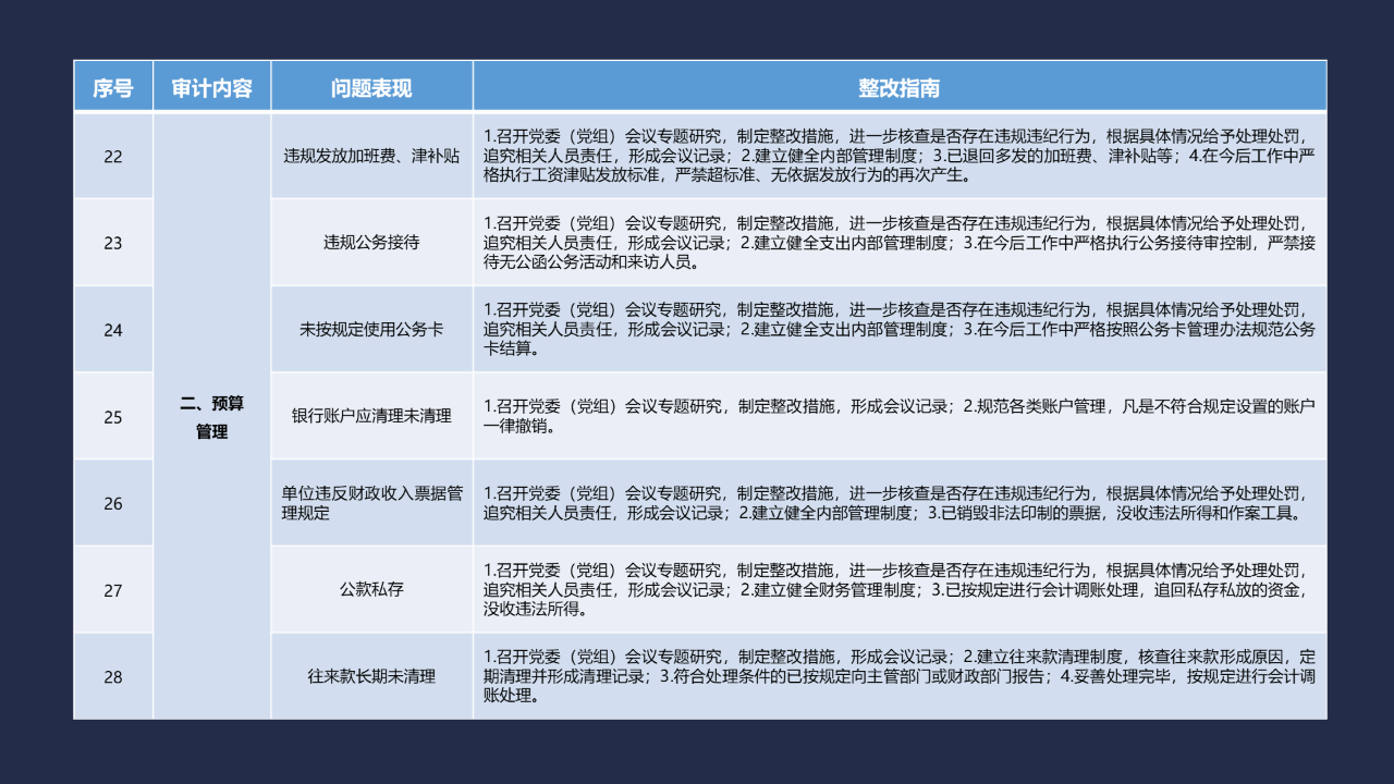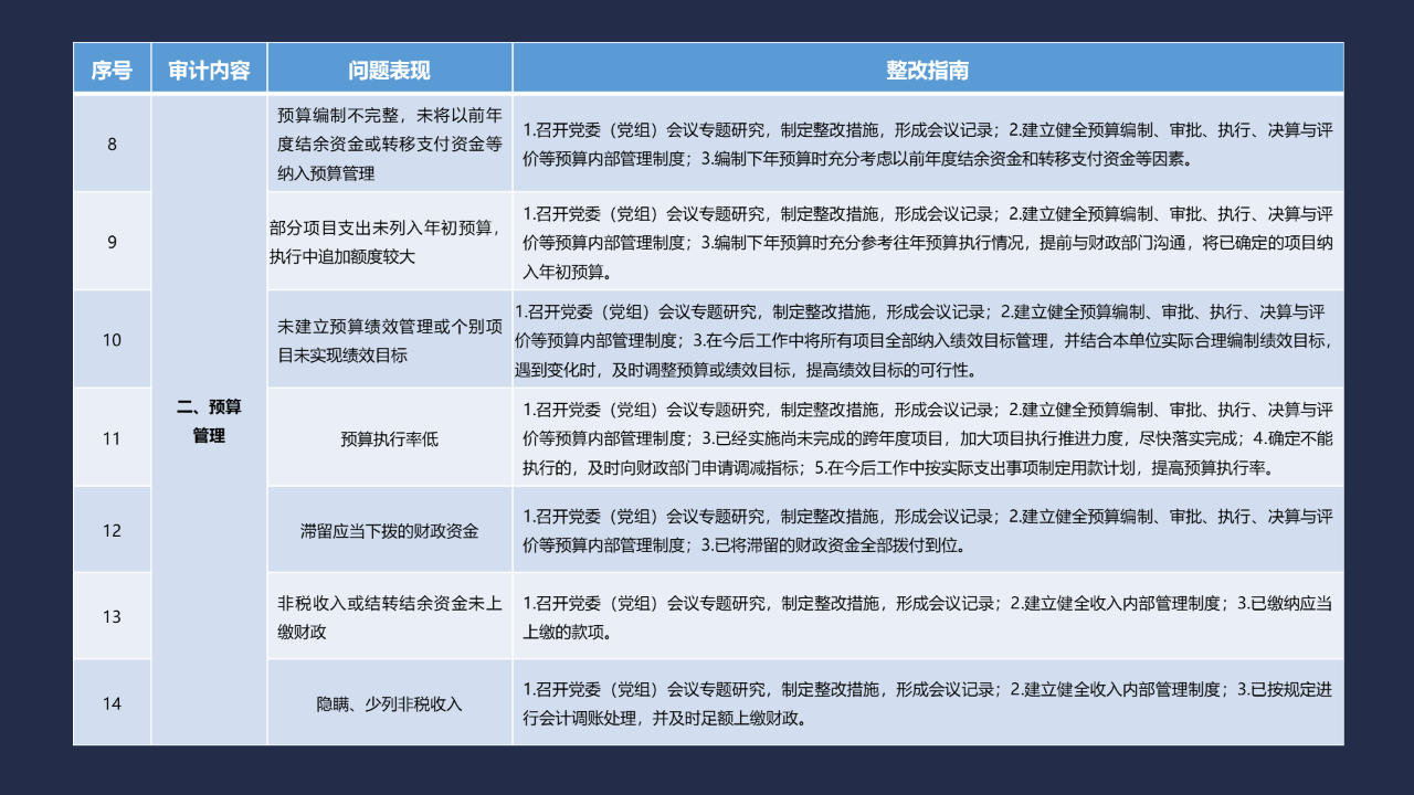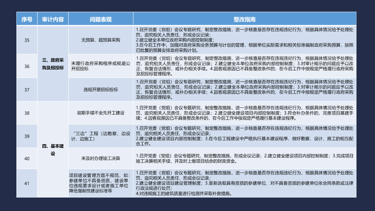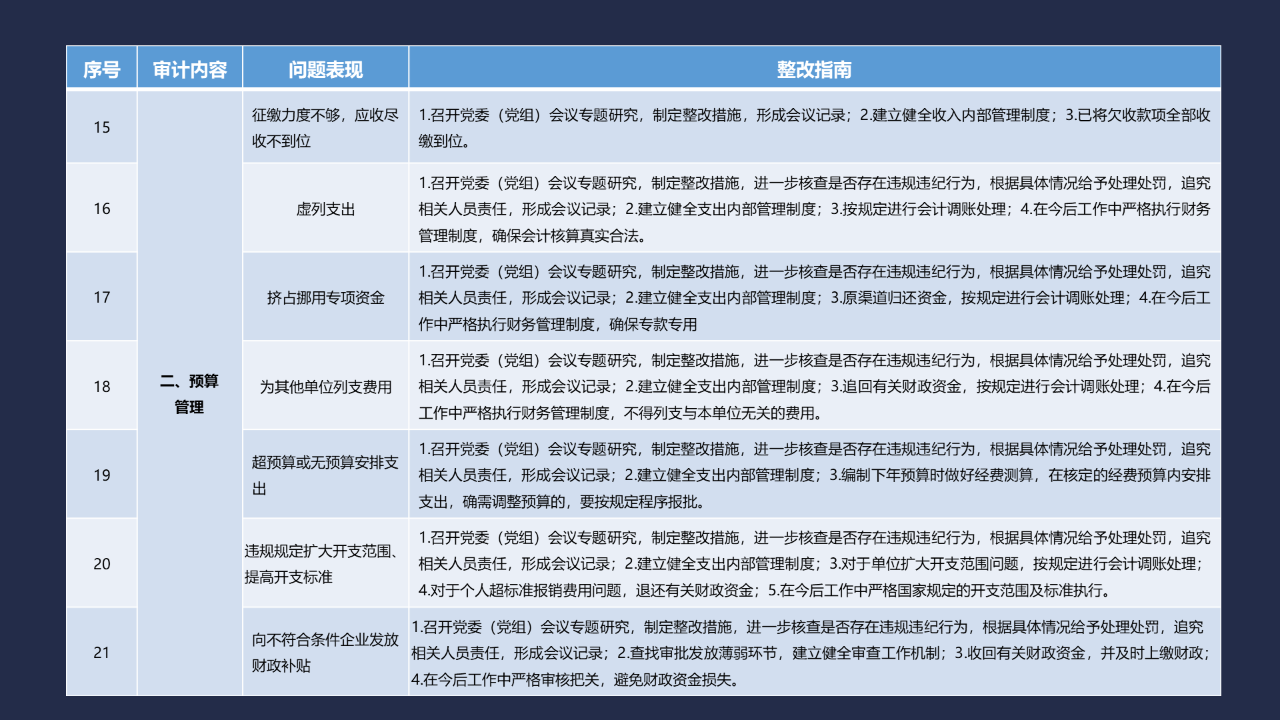 《整改指南100條》按照常見的重大政策措施落實(shí)、預(yù)算管理、政府采購及招投標(biāo)、基本建設(shè)、內(nèi)控管理、企業(yè)管理、自然資源、社保資金及安居工程、金融管理、國外貸援款共10類審計(jì)內(nèi)容進(jìn)行問題分類,列舉了100個(gè)常見問題并給出相對(duì)應(yīng)的整改方法說明,供審計(jì)機(jī)關(guān)和整改責(zé)任單位在審計(jì)整改工作中參照落實(shí)。