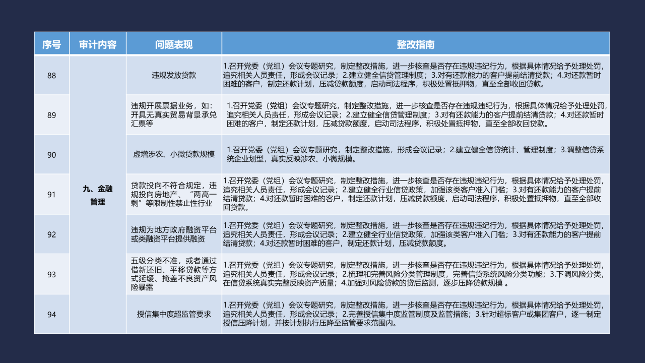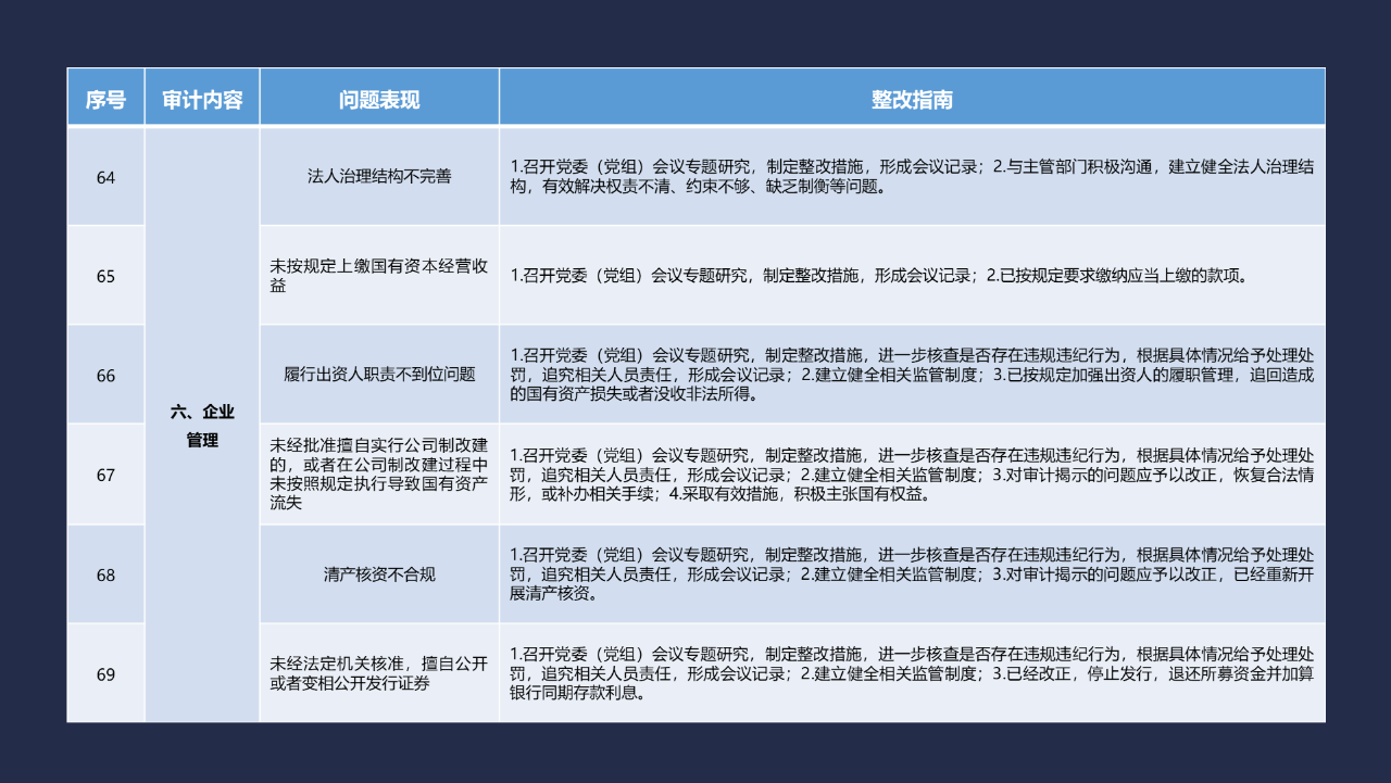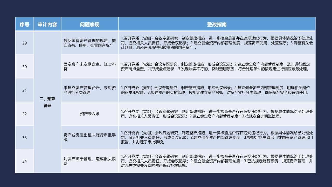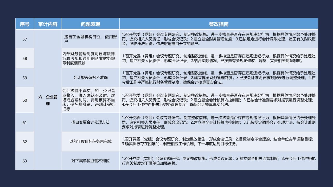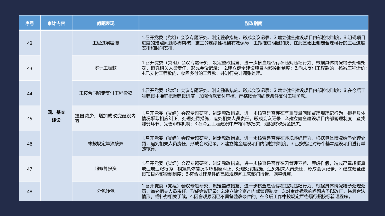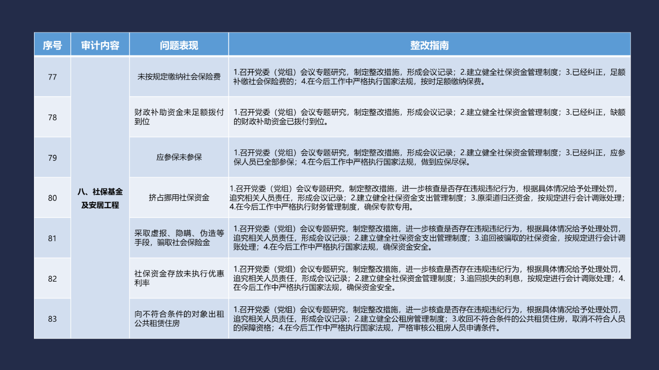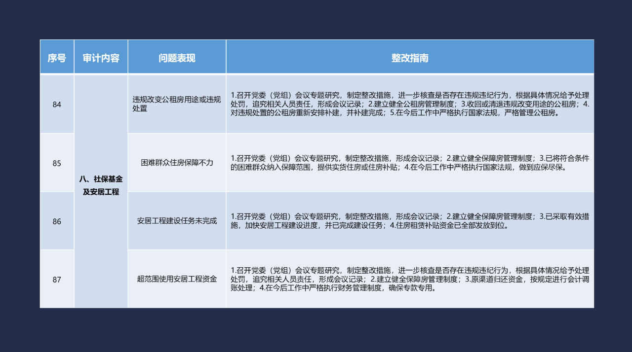 《整改指南100條》按照常見的重大政策措施落實(shí)、預(yù)算管理、政府采購及招投標(biāo)、基本建設(shè)、內(nèi)控管理、企業(yè)管理、自然資源、社保資金及安居工程、金融管理、國外貸援款共10類審計(jì)內(nèi)容進(jìn)行問題分類,列舉了100個(gè)常見問題并給出相對(duì)應(yīng)的整改方法說明,供審計(jì)機(jī)關(guān)和整改責(zé)任單位在審計(jì)整改工作中參照落實(shí)。