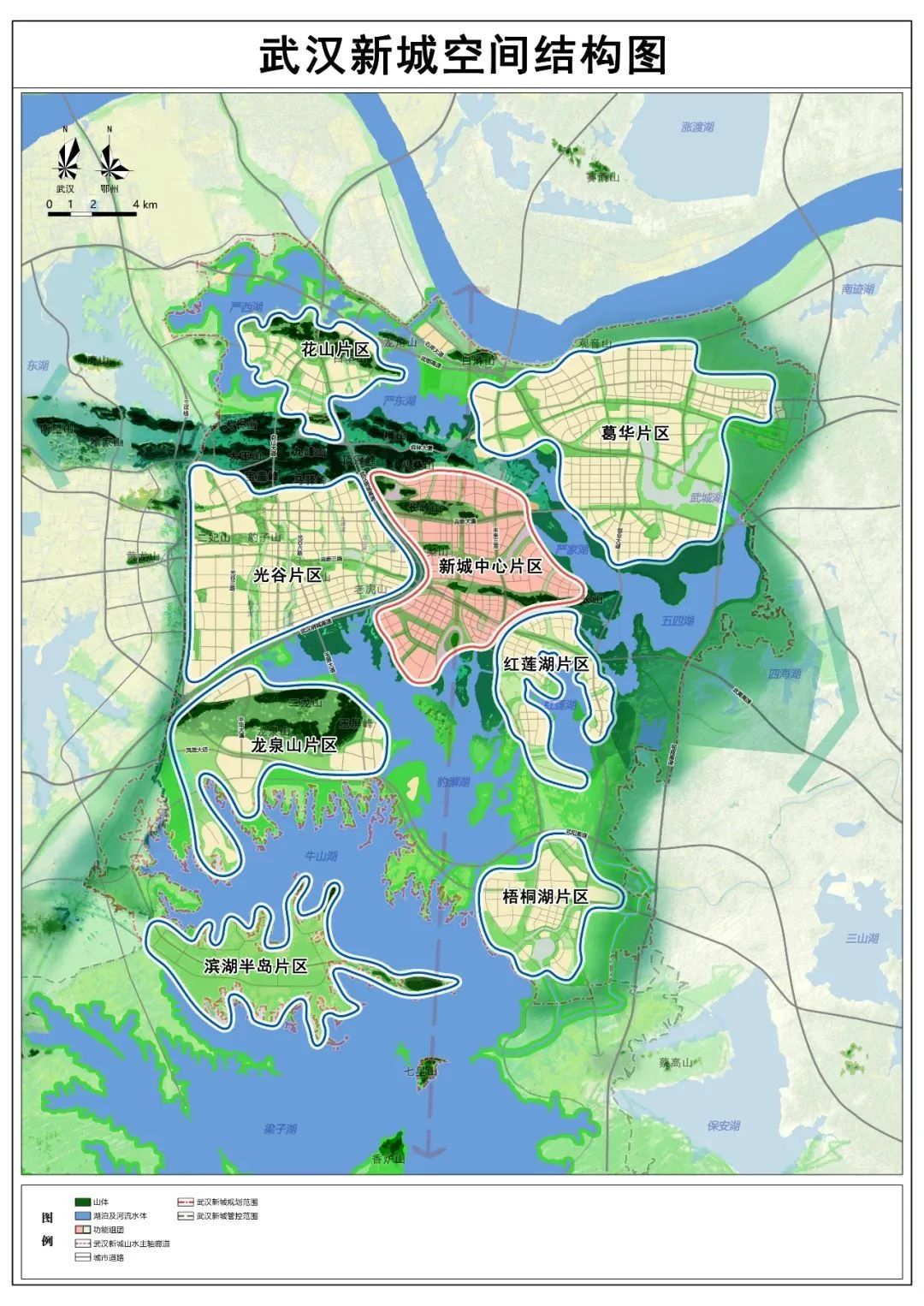 按照“山水城、家園城、智慧城”三大目標,構建山湖相映、組團發(fā)展的空間結(jié)構,劃分新城中心片區(qū)、光谷片區(qū)、葛華片區(qū)、花山片區(qū)、龍泉山片區(qū)、紅蓮湖片區(qū)、梧桐湖片區(qū)、濱湖半島片區(qū)共8大片區(qū),形成產(chǎn)城融合、功能復合的空間布局。