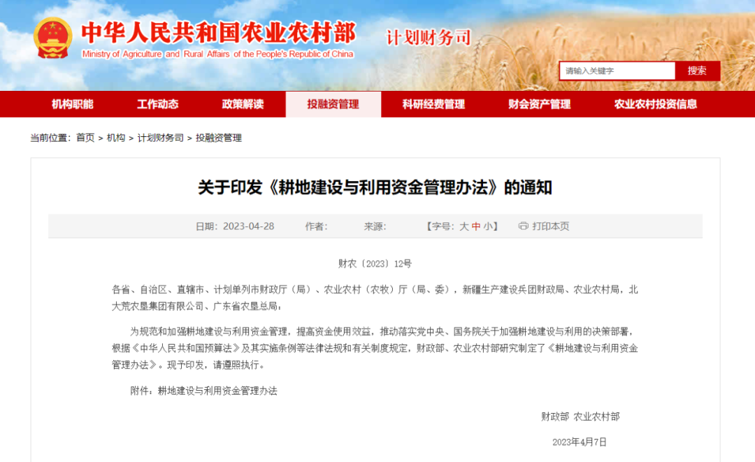 財政部、農(nóng)業(yè)農(nóng)村部印發(fā)《耕地建設(shè)與利用資金管理辦法》