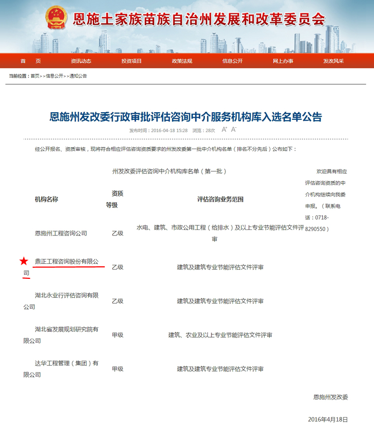 【經(jīng)營成果】我司入圍恩施州發(fā)改委行政審批評估咨詢中介服務(wù)機(jī)構(gòu)庫