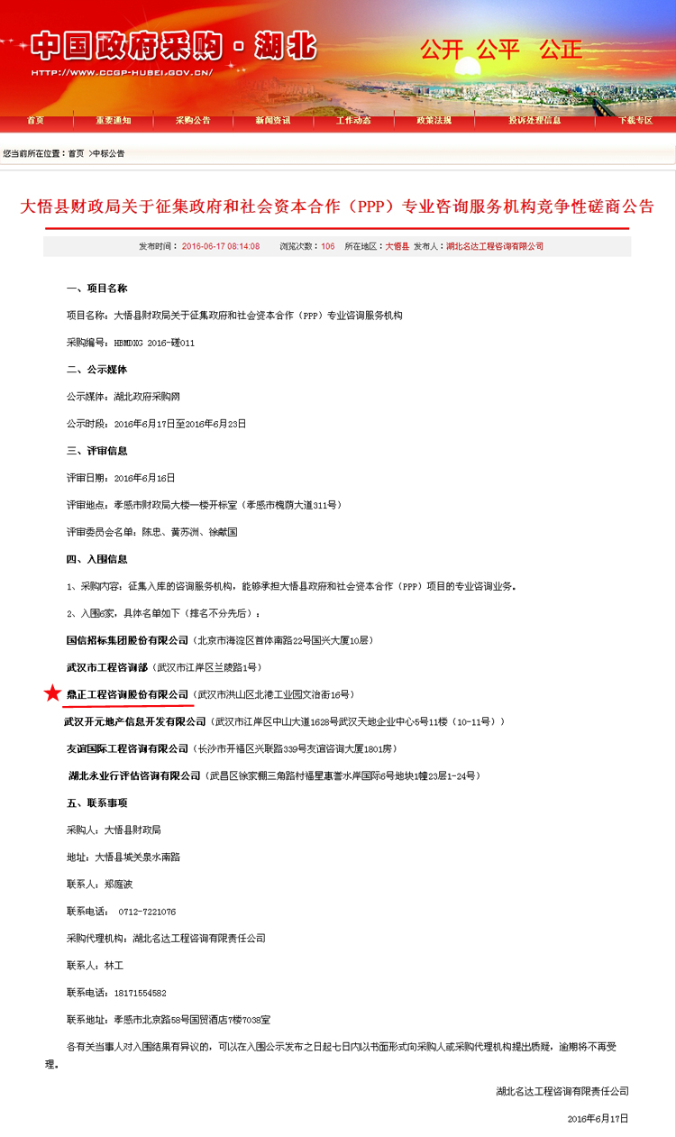【經營成果】我司入圍大悟縣財政局關于征集政府和社會資本合作(PPP)專業(yè)咨詢服務機構