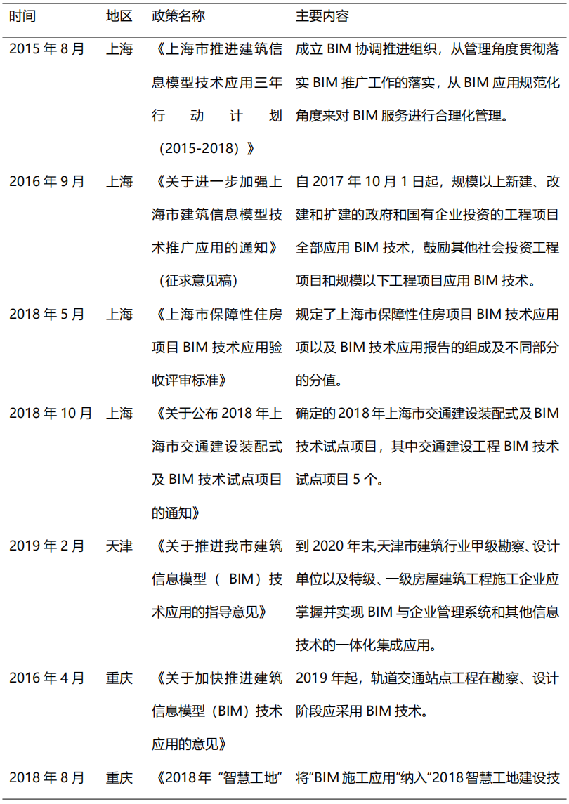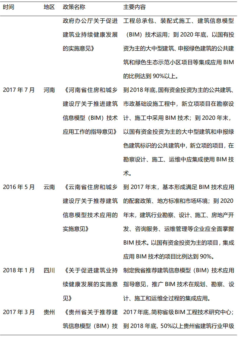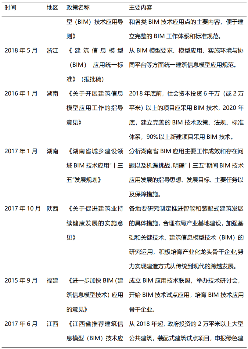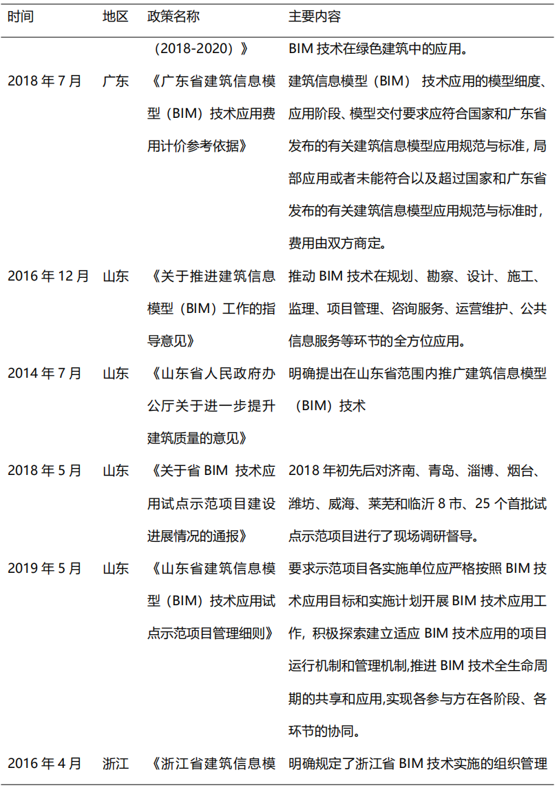 從2014年開始,在住建部的大力推動(dòng)下,各省市政策相繼出臺(tái)BIM推廣應(yīng)用文件,到目前我國(guó)已初步形成BIM技術(shù)應(yīng)用標(biāo)準(zhǔn)和政策體系,為BIM的快速發(fā)展奠定了堅(jiān)實(shí)的基礎(chǔ)。2017年,貴州、江西、河南等省市正式出臺(tái)BIM推廣意見,明確提出在省級(jí)范圍內(nèi)提出推廣BIM技術(shù)應(yīng)用。2018-2019年,各地政府對(duì)于BIM技術(shù)的重視程度不減,重慶、北京、吉林、深圳等多地政策出臺(tái)指導(dǎo)意見,旨在推動(dòng)BIM技術(shù)進(jìn)一步應(yīng)用普及。隨著我國(guó)出臺(tái)BIM推廣意見的省市數(shù)量逐漸增多,全國(guó)BIM技術(shù)應(yīng)用推廣的范圍更加廣泛。表2列舉了部分重要地方鼓勵(lì)政策。