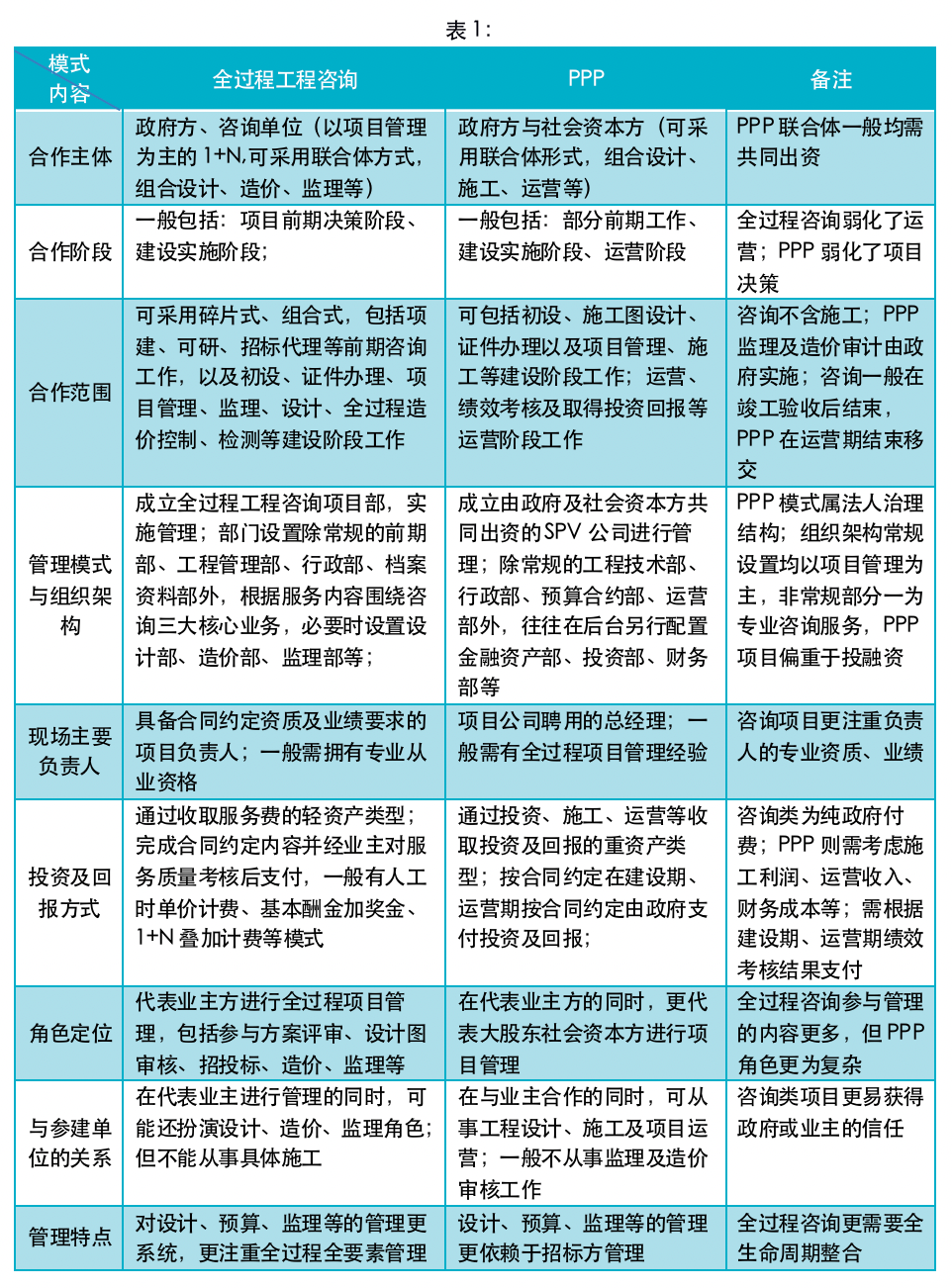 從上面的分析中不難看出,PPP項目關注合法合規(guī)手續(xù),全過程咨詢關注技術及管理協(xié)調(diào);PPP項目更關注投資收益及增值回報,全過程咨詢關注投資控制及進度;PPP項目服務鏈更長,全過程咨詢重點是建設期。