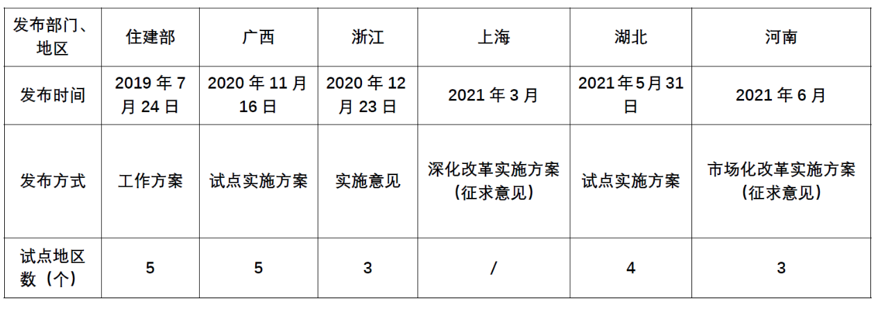 2020年7月24日,住房和城鄉(xiāng)建部辦公廳印發(fā)關(guān)于工程造價(jià)改革工作方案的通知(建辦標(biāo)〔2020〕38號(hào),以下簡(jiǎn)稱(chēng)38號(hào)文),通知決定在北京市、浙江省、湖北省、廣東省、廣西壯族自治區(qū)等五個(gè)地區(qū)開(kāi)展方案試點(diǎn)工作。截至本稿起筆日(2021.6.3),廣西、浙江和湖北等三個(gè)試點(diǎn)地區(qū)相繼發(fā)布有關(guān)方案通知,北京、廣東尚未見(jiàn)官方相關(guān)信息。五個(gè)試點(diǎn)城市外,上海、河南等地的方案在征求意見(jiàn)中。