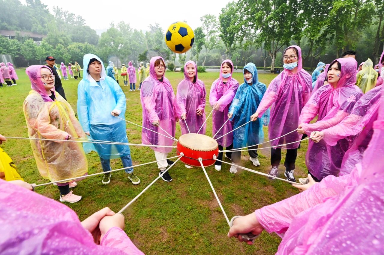 活動當(dāng)天雖當(dāng)天上午持續(xù)陰雨連綿,但是出游的同事們并未停下腳步,路途大巴上交談甚歡載歌載舞,欣喜之情溢于言表,穿上花花綠綠的雨衣在雨霧中穿行,在東湖磨山水墨畫一般的景色中劃出一條彩色的長線,亦是一道別樣的風(fēng)景。