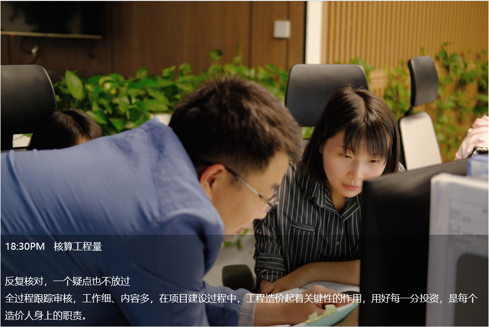 晚上7點,造價部同事還在計算工程量。內(nèi)墻工程量是不是漏算了?混凝土類型是不是用錯了?他們邊檢查邊計算,用嚴(yán)謹(jǐn)?shù)墓ぷ鲬B(tài)度,扎實的專業(yè)技能,細(xì)致的服務(wù)理念,一次又一次贏得客戶的信賴。