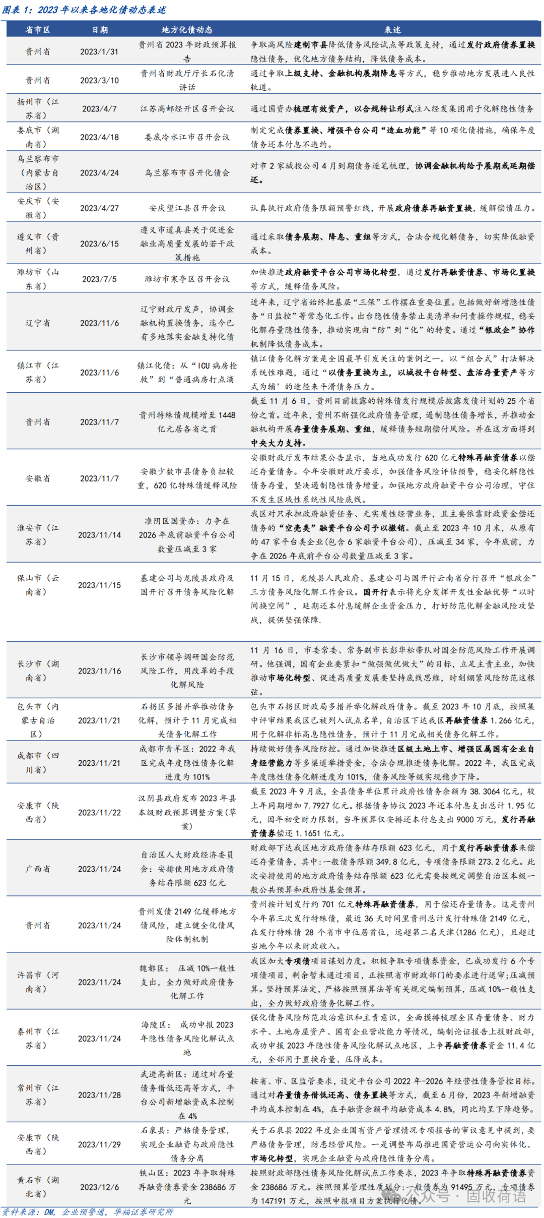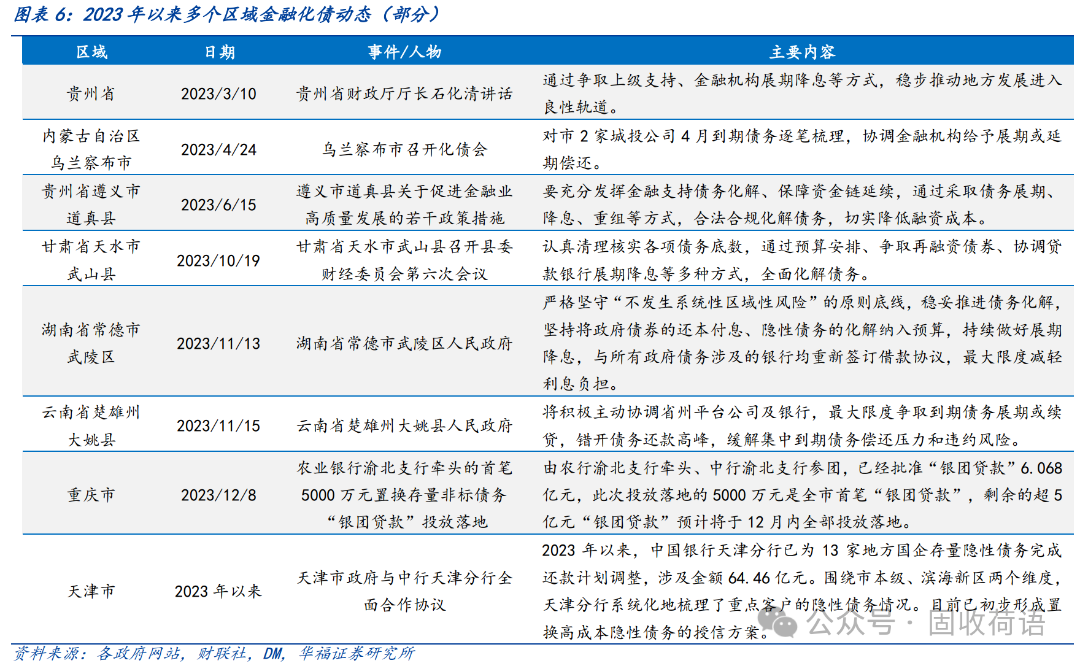 財(cái)政部《地方全口徑債務(wù)清查統(tǒng)計(jì)填報(bào)說(shuō)明》中提出六種常見的債務(wù)化解舉措,具體為(1)安排財(cái)政資金償還;(2)出讓政府股權(quán)以及經(jīng)營(yíng)性國(guó)有資產(chǎn)權(quán)益償還;(3)利用項(xiàng)目結(jié)轉(zhuǎn)資金、經(jīng)營(yíng)收入償還;(4)合規(guī)轉(zhuǎn)化為企業(yè)經(jīng)營(yíng)性債務(wù);(5)通過(guò)借新還舊、展期等方式償還;(6)采取破產(chǎn)重整或清算方式化解。同時(shí),根據(jù)各地化債動(dòng)態(tài)表述,各地根據(jù)自身情況,積極探索了金融機(jī)構(gòu)貸款置換、城投平臺(tái)整合或轉(zhuǎn)型、特殊再融資債置換、設(shè)立化債基金等方式推動(dòng)化債進(jìn)程。
