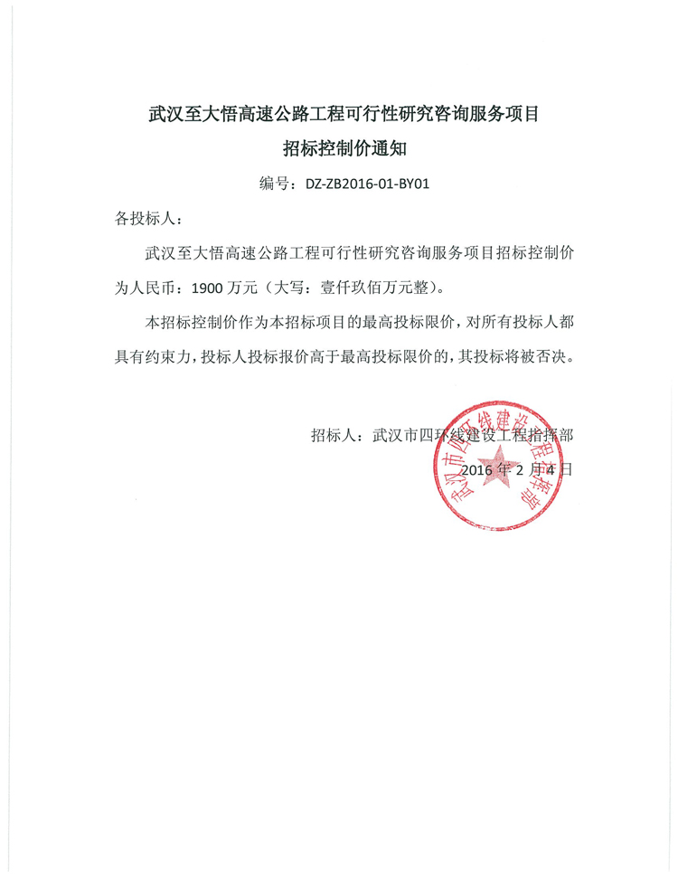 武漢至大悟高速公路工程可行性研究咨詢服務(wù)項(xiàng)目招標(biāo)控制價通知