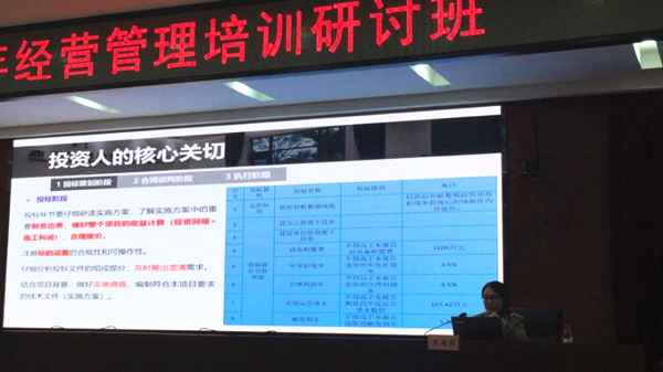 王雁然董事長從“PPP的發(fā)展趨勢”、“PPP概述”、“PPP政策”和“PPP全生命周期實務(wù)操作”四個方面進行了全面系統(tǒng)的講解,PPP高級項目經(jīng)理王海蓮結(jié)合《京山市武荊高速公路連接線七寶山部分礦山地質(zhì)環(huán)境恢復(fù)治理工程PPP項目》(以下簡稱“七寶山PPP項目”)案例分享了投資人的核心關(guān)切與解決方案。七寶山PPP項目是地礦系統(tǒng)參與的第一個PPP項目,也是湖北省首個礦山地質(zhì)環(huán)境恢復(fù)治理工程采用PPP模式實施的項目。王海蓮經(jīng)理分析了該項目從策劃到落地全過程的核心關(guān)切點,并對項目在執(zhí)行過程中可能會出現(xiàn)的風(fēng)險點給出相應(yīng)建議方案。