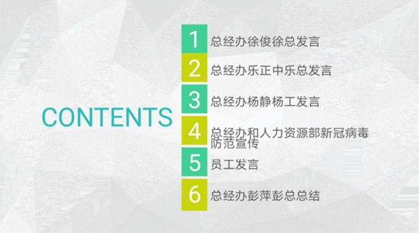 本次會議由人力資源部譚蓉主持,每位同事從自己的生活狀態(tài)到對工作的匯報和對戰(zhàn)勝疫情的決心中娓娓而談,閑話家談中表達(dá)出自己對未來生活的美好祝愿。