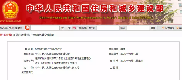 2020年3月3日,住建部50號令“住房和城鄉(xiāng)建設(shè)部關(guān)于修改《工程造價(jià)咨詢企業(yè)管理辦法》《注冊造價(jià)工程師管理辦法》的決定”一夜間在工程咨詢行業(yè)引發(fā)了激烈的討論。