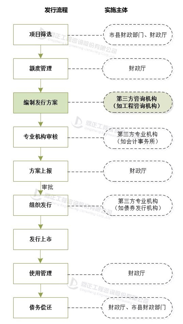 2.執(zhí)行階段。由市縣級財政部門聘請咨詢機構進行方案制定、材料編寫,上報省級財政廳進行審核。土地儲備、收費公路、棚戶區(qū)改造專項債按照財政部相關管理辦法,省級財政廳在額度范圍內報國庫司組織發(fā)行。其他符合自求平衡條件的重點項目由省級政府制定實施方案及專項債管理辦法,報財政部審核通過后,向國庫司申請組織發(fā)行,通過債券市場完成發(fā)行后由省級財政廳轉貸給市縣。