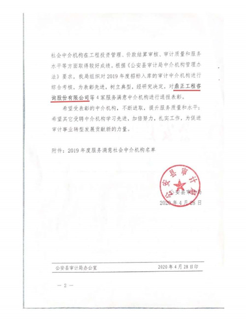 自2019年7月1日鼎正咨詢成為公安縣審計(jì)局的入庫合作單位以來,荊州分公司同事們在工程竣工結(jié)算審計(jì)過程中,精心組織、合理安排、嚴(yán)于律己、廉潔從審,在確保重點(diǎn)工程順利推進(jìn)、節(jié)約政府資金、提高投資效益等方面做出了突出貢獻(xiàn),得到了公安縣相關(guān)單位的一致好評(píng),為公司贏得了信譽(yù)。